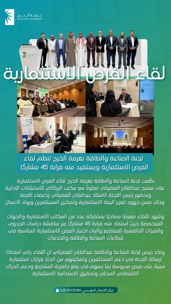 بتنظيم لجنة الصناعة والطاقة بغرفة الخرج ، أُقيم لقاء الفرص الاستثمارية على مسرح عبدالقادر العضياني، بالتعاون مع مكتب البركاتي للاستشارات الإدارية، بهدف استعراض الفرص الواعدة وتعزيز بيئة الاستثمار ودعم التنمية الاقتصادية.