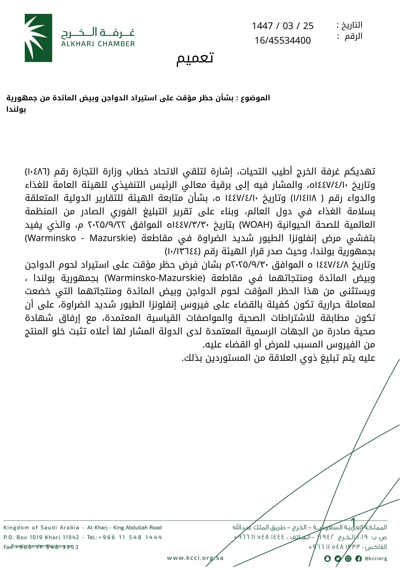 رفع حظر استيراد لحوم الدواجن وبيض المائدة من جمهورية الارجنتين